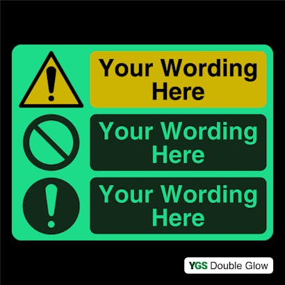 Create your own custom photoluminescent signs in seconds. Ensure your custom safety messages are easily visible when needed the most. Choose your preferred template, size and material then add wording to create your perfect sign. Add a fixing kit for quick and easy installation